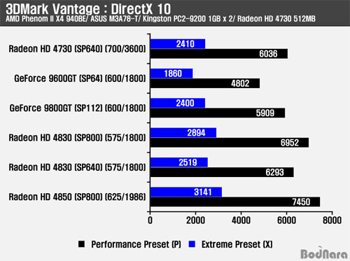 Radeon HD 4730Àº ¸ÕÀú µîÀåÇÑ Radeon HD 4770ó·³ 128bit ¸Þ¸ð¸® ÀÎÅÍÆäÀ̽º¿Í °íŬ·°À» Àû¿ëÇÑ GDDR5 ¸Þ¸ð¸®¸¦ »ç¿ëÇÏ´Â ±¸¼ºÀÌ À¯»çÇÏ¿© ÀÏÁ¤ ¼öÁØÀÇ ¼º´ÉÀÌ ±â´ëµÇ´Â ¸¸Å °æÀï Á¦Ç°°ú ºñ±³ÇÏ¿© 3D ¼º´ÉÀº ¾î´À Á¤µµÀÏÁö ÇÔ²² »ìÆìº¸¾Ò´Ù.     3DMark Vantage : DirectX 10