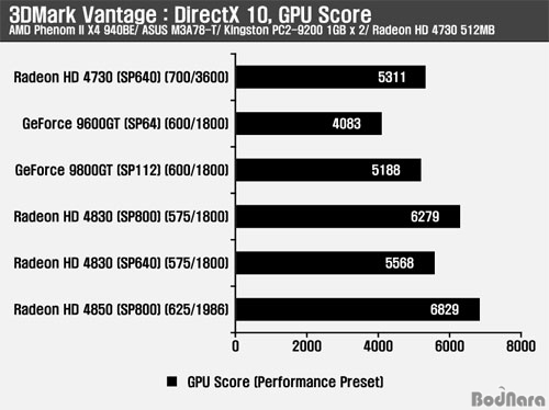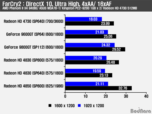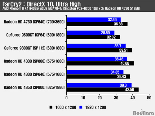 3DMark Vantage´Â ±×·¡ÇÈ Ä«µåÀÇ ±âº» ¼º´ÉÀ» ÃøÁ¤ÇÒ ¼ö ÀÖÀ¸¸ç, Å×½ºÆ®´Â DirectX 10 ȯ°æ¿¡¼ ÁøÇàÇß´Ù. Å×½ºÆ® °á°ú Radeon HD 4730ÀÇ ½ºÄÚ¾î´Â SP640 Radeon HD 4830º¸´Ù ¾à°£ ¶³¾îÁö´Â ¸ð½ÀÀ» º¸¿©ÁÖ¾úÀ¸¸ç, GeForce 9600GT/ 9800GT¸¦ ¾Õ¼°í ÀÖ´Ù. GPU ½ºÄÚ¾î ¿ª½Ã º¥Ä¡¸¶Å© ½ºÄÚ¾î¿Í °°Àº °á°ú¸¦ ³ªÅ¸³Â´Ù.     FarCry2 : DirectX 10