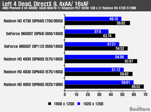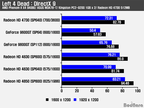 FarCry2 Å×½ºÆ® ¿ª½Ã DirectX 10 ȯ°æ¿¡¼ ÁøÇàµÇ¾úÀ¸¸ç, Å×½ºÆ® °á°ú À̹ø¿¡´Â GeForce ½Ã¸®ÁîµéÀÌ ¼±ÀüÇØÁÖ°í ÀÖ´Ù. GeForce 9800GT´Â Radeon HD 4730À» AA/ AF¸¦ Àû¿ëÇÏÁö ¾ÊÀ» °æ¿ì ¾Õ¼¹À¸¸ç, 4xAA/ 16xAF¸¦ Àû¿ëÇÏÀÚ SP800 Radeon HD 4830µµ ¾Õ¼°í ÀÖ´Ù. Radeon HD 4730Àº AA/ AF°¡ Àû¿ëµÇÁö ¾ÊÀ» ¶§´Â SP640 Radeon HD 4830°ú Å« Â÷ÀÌ ¾ø´Â ¼º´ÉÀ», 4xAA/ 16xAF¸¦ Àû¿ëÇÒ °æ¿ì¿¡´Â 1600 x 1200 ÇØ»óµµ¿¡¼´Â ±Ù¼ÒÇÏ°Ô ¾Õ¼¹°í 1920 x 1200¿¡¼´Â Á¶±Ý ³·Àº ÇÁ·¹ÀÓÀ» Á¦°øÇß´Ù.     Left 4 Dead : DirectX 9