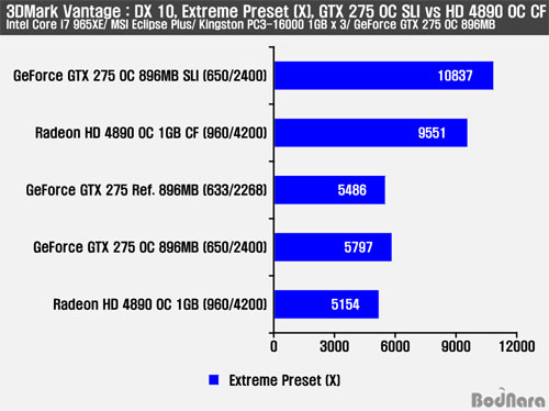 3DMark Vantage´Â Extreme Prest ¼³Á¤ ¼±Åýà 1920 x 1200, 4xAA/ 16xAFÀÇ ¿É¼ÇÀÌ Àû¿ëµÇ´Âµ¥ À̹ø Å×½ºÆ® ¿ª½Ã AA/ AF¸¦ Àû¿ëÇÏÁö ¾Ê¾Ò´ø °á°ú¿Í Å©°Ô ´Ù¸£Áö ¾ÊÀº ¸ð½ÀÀ» º¸¿©ÁÖ°í ÀÖ´Ù. GTX 275 OC ½Ì±Û°ú ºñ±³ÇÑ GTX 275 SLI´Â 1920 ÇØ»óµµ¿¡¼ 86.94% Çâ»ó, HD 4890 OC ½Ì±ÛÀº HD 4890 OC CF¿Í ºñ±³ÇÏ¿© 1920 ÇØ»óµµ¿¡¼ 85.31%ÀÇ Çâ»óµÈ ¼º´ÉÀ» Á¦°øÇÑ´Ù.