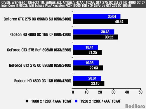 Crysis WarHead¿¡ 4xAA/ 16xAF¸¦ Àû¿ëÇÑ ÈÄ Å×½ºÆ®¸¦ ¿Ï·áÇÑ °á°ú ½Ì±Û GPU·Î¸¸ µ¿ÀÛÇÏ¿´À» ¶§ÀÇ ¼º´ÉÀº GTX 275 ½Ã¸®Á ±Ù¼ÒÇÑ Â÷ÀÌ·Î ¿ì¼¼ÇÑ ¸ð½ÀÀ» º¸¿©ÁØ´Ù. À̹ø °ÔÀÓ ¿ª½Ã ¸ÖƼ GPU ·»´õ¸µ ±¸¼ºÀ» »ç¿ëÇÒ °æ¿ì GTX 275 OC ¹öÀüÀÇ SLI ±¸¼ºÀÌ °¡Àå ³ôÀº ¼º´ÉÀ» º¸¿©ÁÖ°í ÀÖ´Ù.