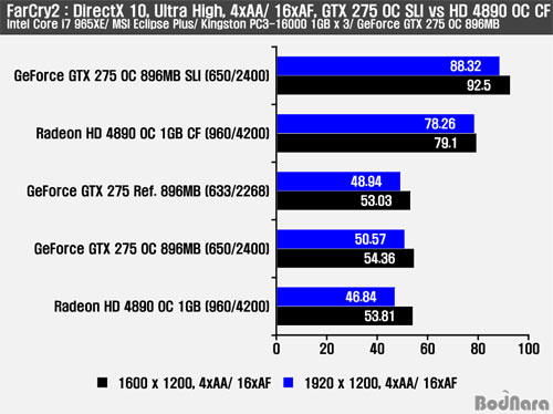 FarCry2¿¡ 4xAA/ 16xAF¸¦ ÇØ»óµµº°·Î Àû¿ëÇÏ¿´À» ¶§ÀÇ °á°ú´Â ½Ì±Û ±¸¼º¿¡¼´Â GTX 275 OC°¡ °¢ ÇØ»óµµ¿¡¼ ±Ù¼ÒÇÑ Â÷ÀÌ·Î HD 4890 OC ½Ì±ÛÀÇ ¼º´ÉÀ» ¾Õ¼¹´Ù. ¸ÖƼ GPU ·»´õ¸µ ±¸¼º¿¡¼´Â ¿©ÀüÈ÷ GTX 275 OC SLI ±¸¼ºÀÌ °¡Àå ³ôÀº ¼º´ÉÀ» Á¦°øÇÑ´Ù. GTX 275 OC ½Ì±ÛÀº GTX 275 SLI¿Í ºñ±³ÇÏ¿© 1600/ 1920 ÇØ»óµµ¿¡¼ °¢°¢ 70.16/ 74.65%ÀÇ Çâ»ó, HD 4890 OC ½Ì±ÛÀº HD 4890 OC CF¿Í ºñ±³ÇÏ¿© 1600/ 1920 ÇØ»óµµ¿¡¼ °¢°¢ 46.99/ 67.08%ÀÇ Çâ»óÀ» º¸¿©ÁØ´Ù.
