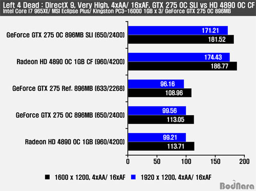 Left 4 Dead´Â ÇÏÇÁ¶óÀÌÇÁ ¼Ò½º ¿£Áø ±â¹ÝÀ¸·Î AMD ATI Radeon¿¡ º¸´Ù ÃÖÀûÈµÈ °ÔÀÓÀÌ´Ù. AA/ AF¸¦ Àû¿ëÇÏÁö ¾Ê¾ÒÀ» ¶§¿Í ¸¶Âù°¡Áö·Î 4xAA/ 16xAF¸¦ Àû¿ëÇÒ °æ¿ì ½Ì±Û ±¸¼º¿¡¼ 1600 ÇØ»óµµ´Â ±Ù¼ÒÇÏ°Ô HD 4890 OC°¡ ¾Õ¼¹°í 1920 ÇØ»óµµ¿¡¼´Â GTX 275 OC°¡ ±Ù¼ÒÇÏ°Ô ¾Õ¼¹´Ù. ¸ÖƼ GPU ·»´õ¸µ ±¸¼º¿¡¼´Â ´Ù¸¥ º¥Ä¡¸¶Å© ¹× °ÔÀÓ°ú ´Þ¸® HD 4890 OC CrossFire ±¸¼ºÀÌ °¡Àå ¿ì¼öÇÑ ¼º´ÉÀ» º¸¿©ÁØ´Ù.