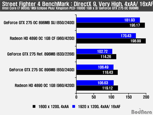 GTX 275 OC ½Ì±ÛÀº GTX 275 SLI¿Í ºñ±³ÇÏ¿© 1600/ 1920 ÇØ»óµµ¿¡¼ °¢°¢ 60.57/ 71.97%ÀÇ Çâ»ó, HD 4890 OC ½Ì±ÛÀº HD 4890 OC CF¿Í ºñ±³ÇÏ¿© 1600/ 1920 ÇØ»óµµ¿¡¼ °¢°¢ 64.25/ 75.82%ÀÇ Çâ»óÀ» º¸¿´´Ù.