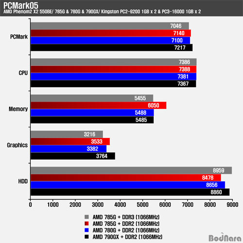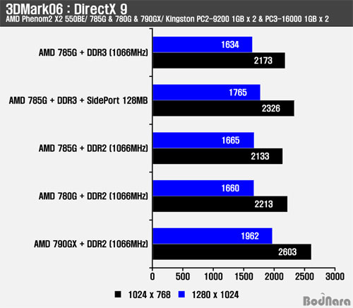 700MHz°¡ Àû¿ëµÈ 790GX°¡ ÇØ»óµµº°·Î °¡Àå ³ôÀº ¼º´ÉÀ», 785G DDR2/ DDR3 ¸Þ¸ð¸® Àû¿ë°á°ú¿Í