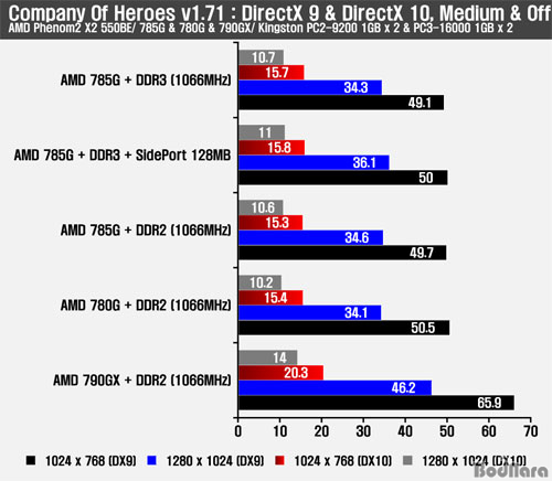 1.71 ¹öÀüÀ¸·Î ÁøÇàÇßÀ¸¸ç, DirectX9¿Í 10 ȯ°æ, ±×¸®°í ±×·¡ÇÈ ¿É¼ÇÀº ¹Ìµð¾ö ¶Ç´Â Off·Î ÅëÀÏÇß´Ù. COHÀÇ Å×½ºÆ® °á°ú 785G DDR2/ DDR3, 780G DDR2 Á¶ÇÕ °£ÀÇ