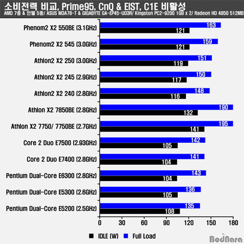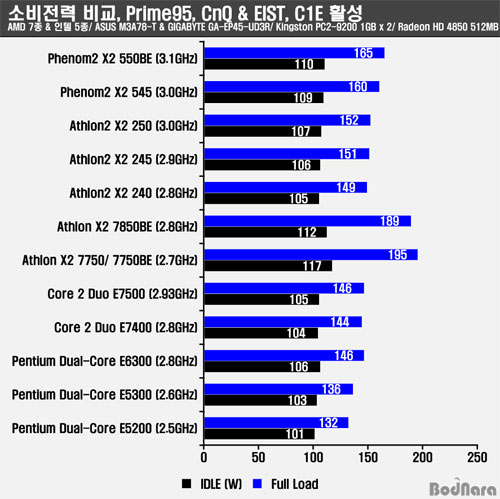¼ÒºñÀü·ÂÀº Àü¹ÝÀûÀ¸·Î ÀÎÅÚ CPUµéÀÌ ´õ ³·Àº ¸ð½ÀÀ» º¸¿©ÁÖ¾úÀ¸¸ç, 45nm °øÁ¤ÀÌ Àû¿ëµÈ AMD Æä³Ñ2 X2 500 ½Ã¸®Áî¿Í ¾Ö½½·Ð2 X2 200 ½Ã¸®Áî´Â 65nm ¾Ö½½·Ð X2 7000 ½Ã¸®Á´Ù´Â Å©°Ô ³·¾ÆÁø ¸ð½ÀÀ» º¸¿©ÁØ´Ù.