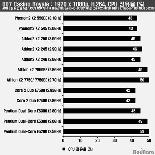 HD Àç»ý Áß CPU Á¡À¯À²Àº °°Àº µà¾óÄÚ¾î CPUµéÀÌ¶óµµ Å¬·°ÀÌ ³ôÀº Á¦Ç°µéÀÌ Á¶±Ý ´õ ³·Àº CPU Á¡À¯À²À» Á¦°øÇßÀ¸¸ç, Àü¹ÝÀûÀ¸·Î 50% ³»¿ÜÀÇ CPU Á¡À¯À²À» ±â·ÏÇß´Ù. HD Àç»ý ÁßÀÇ ¼ÒºñÀü·ÂÀº ÀÎÅÚ CPUµéÀÌ Àü¹ÝÀûÀ¸·Î ´õ ³·°Ô ÃøÁ¤µÇ¾ú´Ù.