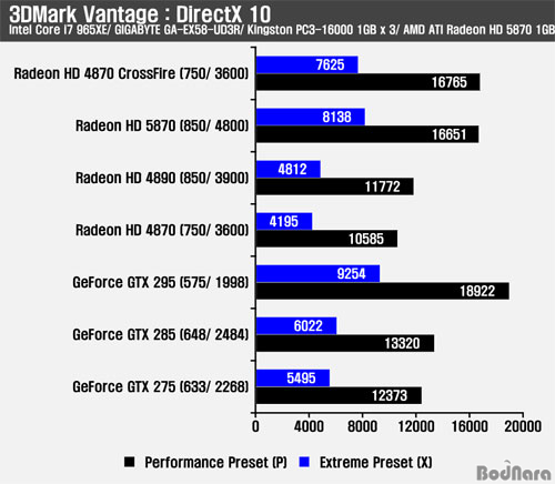 À̹ø Àå¿¡¼´Â HD 5870°ú HD 4870À» 2°³ ¹¾î CrossFire (ÀÌÇÏ, CF)¸¦ ±¸¼ºÇÑ °á°ú, GTX 295/ GTX 285/ GTX 275, HD 4890/ HD 4870 Á¦Ç°µéÀÇ AA/ AF¸¦ Àû¿ëÇÏÁö ¾ÊÀº ¼º´ÉÀ» ºñ±³Çß´Ù.   3DMark Vantage : DirectX 10