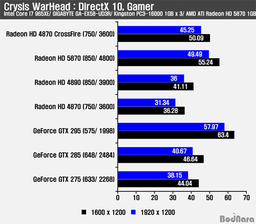 HD 5870Àº ´ÜÀÏ GPUÀÎ RV870 Çϳª°¡ »ç¿ëµÇÁö¸¸, ÀÌÀü ¼¼´ëÀÎ HD 4870 2°³¸¦ CF ±¸¼ºÇÑ °á°ú¿Í ÆÛÆ÷¸Õ½º ÇÁ¸®¼ÂÀº ±Ù¼ÒÇÑ Â÷À̸¦ º¸¿´°í ÀͽºÆ®¸² ÇÁ¸®¼ÂÀº ¿ÀÈ÷·Á ´õ ³ªÀº °á°ú¸¦ ±â·ÏÇß´Ù. HD 5870Àº µà¾ó GPU ±¸¼ºÀÎ GeForce GTX 295¿¡ ¹ÌÄ¡Áö´Â ¸øÇßÀ¸³ª ÀͽºÆ®¸² ÇÁ¸®¼ÂÀÇ °á°ú´Â »ó´çºÎºÐ Á¢±ÙÇÏ´Â °á°ú¸¦, ½Ì±Û GPU·Î ³ôÀº ¼º´ÉÀ» Á¦°øÇß´ø GeForce GTX 285¸¦ ³Ñ¾î¼´Â °á°ú¸¦ Á¦°øÇÑ´Ù.   Crysis WarHead : DirectX 10