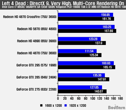 Left 4 Dead´Â ´Ù¸¥ °ÔÀÓµé°ú ´Þ¸® DirectX 9 ȯ°æÀÇ °ÔÀÓÀ¸·Î HD 5870Àº ´Ù¸¥ °ÔÀÓµé°ú ºñ±³ÇÏ¿© ½Ì±Û GPUÀÓ¿¡µµ °¡Àå ³ôÀº ¼º´ÉÀ» Á¦°øÇϰí ÀÖÀ¸¸ç, HD 4870 CF ±¸¼ºµµ ¾à°£ ³Ñ¾î¼´Â ¼º´ÉÀ» º¸¿©ÁØ´Ù. |  |