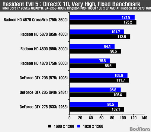HD 5870Àº 3DMark Vantage¿¡ À̾î Crysis WarHead¿¡¼µµ ÁÁÀº °á°ú¸¦ º¸¿©Áִµ¥ ½Ì±Û ±×·¡ÇÈÄ«µåµé Áß¿¡¼ °¡Àå ³ôÀº ÇÁ·¹ÀÓÀ» Á¦°øÇßÀ¸¸ç, GeForce GTX 295¿¡´Â ¹ÌÄ¡Áö ¸øÇßÁö¸¸, HD 4870 CF ±¸¼ºÀ» ³Ñ¾î¼´Â ³ôÀº ÇÁ·¹ÀÓÀ» Á¦°øÇÑ´Ù.   Resident Evil 5 : DirectX 10