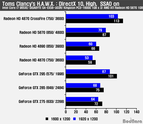 HD 5870Àº Residen Evil 5¿¡¼´Â 3DMark Vantage¿Í Crysis WarHead¿¡¼ÀÇ °á°ú¿Í ´Þ¸® µà¾ó GPU ±¸¼ºÀÎ GeForce GTX 295¸¦ ±Ù¼ÒÇÑ Â÷ÀÌ·Î 1600 x 1200 ÇØ»óµµ¿¡¼´Â ¾Õ¼¹À¸¸ç, 1920 x 1200 ÇØ»óµµ¿¡¼´Â ¾à 7 ÇÁ·¹ÀÓÀ¸·Î ±ÙÁ¢ÇÑ ÇÁ·¹ÀÓÀ» Á¦°øÇß´Ù. HD 4870 CF ±¸¼ºÀº Å×½ºÆ® Ä«µåµé Áß °¡Àå ³ôÀº ÇÁ·¹ÀÓÀ» Á¦°øÇϰí ÀÖ´Ù.   Toms Clancy's H.A.W.X. : DirectX 10