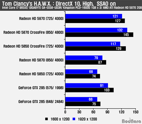 H.A.W.X. Å×½ºÆ®¿¡¼´Â °¡Àå ³ôÀº Ŭ·°À¸·Î CrossFire¸¦ ±¸¼ºÇÏ´Â HD 5870 CF°¡ Å×½ºÆ®¸¦ ÁøÇàÇÑ ÇØ»óµµº°·Î °¡Àå ³ôÀº ÇÁ·¹ÀÓÀ» Á¦°íÇßÀ¸¸ç, HD 5850 CF ±¸¼ºÀº 1600¿¡¼´Â HD 5970À» ±Ù¼ÒÇÏ°Ô ¾Õ¼¹°í 1920¿¡¼´Â HD 5970º¸´Ù ¶³¾îÁö´Â ÇÁ·¹ÀÓÀ» Á¦°øÇß´Ù.