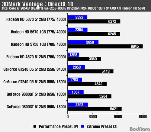 À̹ø¿¡´Â ¶óµ¥¿Â HD 5670 (Radeon HD 5670)ÀÌ °æÀï Á¦Ç°ÀÎ ÁöÆ÷½º GT240 (GeForce GT240) µî°ú ºñ±³ÇÏ¿© ¾î´À Á¤µµÀÇ ¼º´ÉÀ» Á¦°øÇϰí ÀÖ´ÂÁö¸¦ È®ÀÎÇØº¸¾Ò´Ù.   3DMark Vantage : DirectX 10