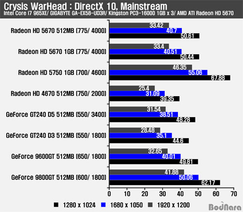3DMark Vantage´Â DirectX 10 ±â¹ÝÀ¸·Î ±×·¡ÇÈÄ«µåÀÇ ±âº» ¼º´ÉÀ» È®ÀÎÇÒ ¼ö Àִµ¥ ¶óµ¥¿Â HD 5670 1GB¿Í 512MBÀÇ ½ºÄÚ¾î´Â ±Ù¼ÒÇÑ Â÷À̸¦ º¸¿´À¸¸ç, »óÀ§ Á¦Ç°À¸·Î º¼ ¼ö ÀÖ´Â GeForce 9800GT¿¡ ±ÙÁ¢ÇÏ´Â ½ºÄھ Á¦°øÇß´Ù. °æÀï Á¦Ç°ÀÎ GeForce GT240 D3 (GDDR3)/ D5 (GDDR5) ¹öÀü°ú ºñ±³ÇÏ¿© ²Ï ¸¹Àº ½ºÄÚ¾î Â÷À̸¦ ³»ÁÖ°í ÀÖ´Ù. ¶Ç, ¶óµ¥¿Â HD 5670Àº »óÀ§ÀÇ ¶óµ¥¿Â HD 5750°ú´Â ²Ï ¸¹Àº ½ºÄÚ¾î Â÷À̰¡ ³ªÅ¸³µ´Ù.   Crysis WarHead : DirectX 10