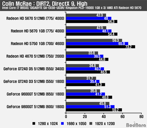 Crysis WarHead´Â °í¼º´ÉÀ» ¿ä±¸ÇÏ´Â °ÔÀÓ ÁßÀÇ Çϳª·Î 10¸¸¿ø ÃʹÝÀÇ °¡°ÝÀ» Çü¼ºÇϰí ÀÖ´Â ¶óµ¥¿Â HD 5670Àº ¸ÞÀνºÆ®¸² ±×·¡Çȼ³Á¤°ú DirectX 10À» ¼±ÅÃÇÏ¿© Å×½ºÆ®¸¦ ÁøÇàÇßÀ¸¸ç, AA/ AF °á°ú´Â º¥Ä¡¸¶Å© ÇÁ·Î±×·¥°ú µå¶óÀ̹ö ÄÁÆ®·Ñ ÆÐ³Î ¸ðµÎ Àû¿ëµÇÁö ¾ÊÀº ¼º´ÉÀÌ È®ÀεǾî ÀÌÈÄ ´Ù·ê AA/ AF °á°ú¿¡¼´Â Á¦¿ÜÇß´Ù. ¸ÞÀνºÆ®¸²À¸·Î ¼³Á¤ÇÑ ¶óµ¥¿Â HD 5670Àº 3DMark VantageÀÇ °á°ú¿Í ´Þ¸® GeForce 9800GT¿Í´Â ÇÁ·¹ÀÓ Â÷À̰¡ Á¦¹ý ³ªÅ¸³µÀ¸¸ç, °æÀï Á¦Ç°ÀÎ GeForce GT240 D3/ D5 ¹öÀüÀº ¸ðµÎ ¾Õ¼¹°í GeForce 9600GTµµ ±Ù¼ÒÇÏ°Ô ¾Õ¼´Â ÇÁ·¹ÀÓÀ» Á¦°øÇß´Ù. HD 4670À» ´ëüÇÏ´Â ¸¸Å HD 4670°úµµ ÇÁ·¹ÀÓ Â÷À̸¦ ²Ï ¸¹ÀÌ ³ªÅ¸³»Áá´Ù.   Colin McRae : DiRT2 : DirectX 9
