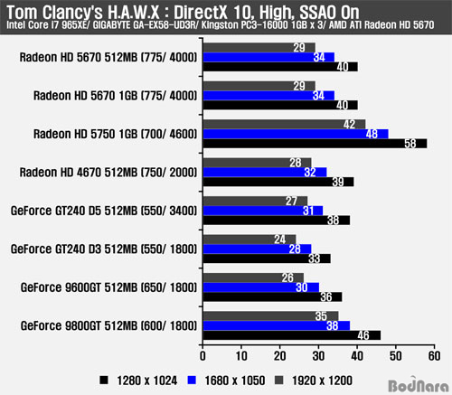 Äݸ° ¸Æ·¹ÀÌ ´õÆ®2´Â °æÀï Á¦Ç°ÀÌ DirectX 11À» Áö¿øÇÏÁö ¾ÊÀ¸¹Ç·Î ¿©±â¿¡¼´Â DirectX 9 ȯ°æ¿¡¼ÀÇ °á°ú¸¸ ºñ±³ÇßÀ¸¸ç, Æò±Õ ÇÁ·¹ÀÓ¸¸ °á°ú·Î ³ªÅ¸³Â´Ù. HD 4670À» ´ëüÇÏ´Â HD 5670Àº ¾Õ¼ÀÇ °á°úµéó·³ HD 4670°ú´Â ÇÁ·¹ÀÓ Çâ»óÀÌ Å©°Ô ³ªÅ¸³µÀ¸¸ç, GeForce 9800GT¿¡µµ ±ÙÁ¢ÇÑ ¼º´ÉÀ» Á¦°øÇÑ´Ù. ¶óµ¥¿Â HD 5670°ú °æÀïÀÌ µÇ´Â GeForce GT240 D3/ D5¿Í 9600GT´Â ¶óµ¥¿Â °è¿º¸´Ù ³·Àº ¼º´ÉÀ» ³»ÁÖ°í ÀÖ´Ù. HD 5670Àº ¿©ÀüÈ÷ HD 5750°ú´Â ÇÁ·¹ÀÓ Â÷À̰¡ ²Ï ³ªÅ¸³ª°í ÀÖ´Ù.   Tom Clancy's H.A.W.X : DirectX 10
