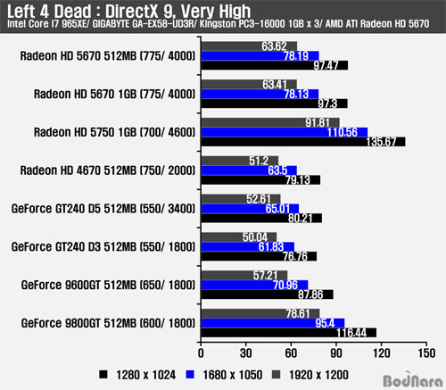 H.A.W.X´Â DirectX 10 ȯ°æ¿¡¼ Å×½ºÆ®°¡ ÁøÇàµÇ¾úÀ¸¸ç, À̹ø º¥Ä¡¸¶Å© °á°úµµ ¶óµ¥¿Â °è¿ÀÇ ÇÁ·¹ÀÓÀÌ ³ô°Ô ³ªÅ¸³µ´Ù. ¶óµ¥¿Â HD 5670Àº 1GB¿Í 512MB »çÀÌ¿¡´Â ÇÁ·¹ÀÓ Â÷À̰¡ ³ªÅ¸³ªÁö ¾Ê¾Ò°í GeForce 9600GT¿Í GT240 D3/ D5¸¦ ¾Õ¼± ÇÁ·¹ÀÓÀ» Á¦°øÇÑ´Ù. À̹ø Å×½ºÆ®´Â ´Ù¸¥ °ÔÀÓµé°ú ´Þ¸® GeForce 9600GT°¡ GT240 D5 ¹öÀüº¸´Ù ¾à°£ ³·Àº ÇÁ·¹ÀÓÀ» Á¦°øÇÑ´Ù.   Left 4 Dead : DirectX 9