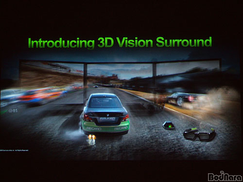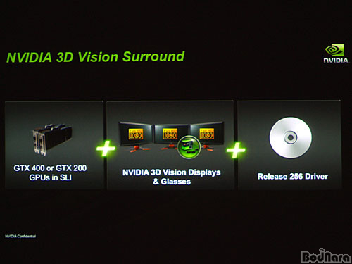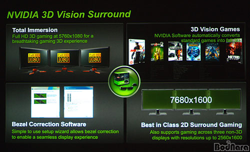 ÀÌÈÄ ¿£ºñµð¾Æ´Â 3DTV¿¡ 3D ȯ°æÀ» ±¸ÇöÇÒ ¼ö ÀÖ´Â 3DTV Play ±â¼úÀ» Áö¿øÇϱ⠽ÃÀÛÇß°í GF100ÀÌ Àû¿ëµÈ ÁöÆ÷½º GTX 470°ú GTX 480À» ¹ßÇ¥ÇÏ´Â ½ÃÁ¡¿¡ °æÀï»çÀÎ AMD ATI°¡ ¸ÖƼµð½ºÇ÷¹ÀÌ È®Àå ±â¼ú·Î ¼Ò°³ÇÑ ATI Eyefinity¿¡ ´ëÀÀµÉ ¼ö ÀÖ´Â 3D ºñÀü ¼¶ó¿îµå (3D Vision Surround) ±â¼úÀ» ¹ßÇ¥Çß´Ù.