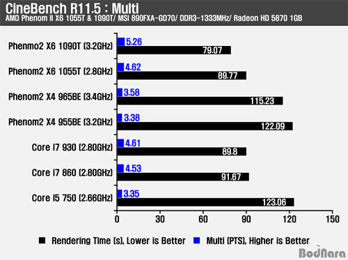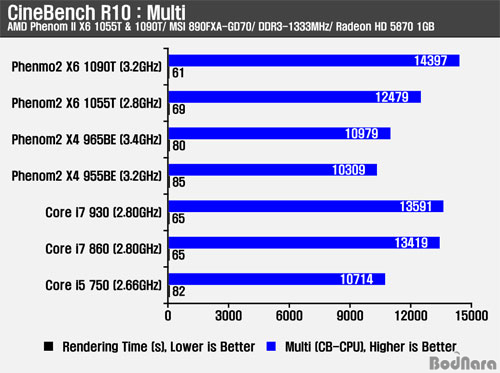 À̹ø CineBench R10 ¸ÖƼ Å×½ºÆ®¿¡¼ ³ªÅ¸³ªµíÀÌ ¹°¸®ÄÚ¾î 6°³·Î 6°³ÀÇ ½º·¹µå¸¦ Á¦°øÇÏ´Â Æä³Ñ2 X6 1090T¿Í 1055T 2Á¾Àº °¢°¢ °æÀï Á¦Ç°À̵Ǵ ÄÚ¾î i7 860°ú ÄÚ¾î i5 750°ú ºñ±³ÇØ Ã³¸® ½Ã°£ ¹× 󸮷®¿¡¼ ´õ À¯¸®ÇÑ ¸ð½ÀÀ» º¸¿©ÁÖ¾î ¹°¸®Äھ ³í¸®ÄÚ¾î¿Í Á¶ÇյǴ ÀÎÅڰ迺¸´Ù À¯¸®ÇÑ °ÍÀ¸·Î È®ÀεǾú´Ù.