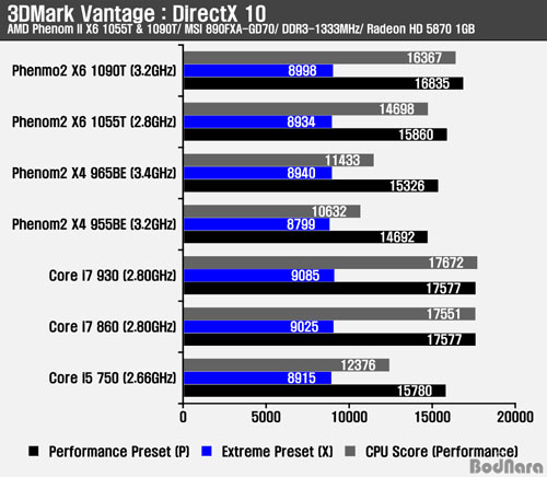 3DMark Vantage´Â ±×·¡ÇÈÄ«µåÀÇ ±âº» ¼º´ÉÀ» ºñ±³ÇÒ ¼ö ÀÖÁö¸¸, ±×·¡ÇÈÄ«µå »Ó¸¸ ¾Æ´Ï¶ó CPU ¼º´ÉÀÇ ¿µÇâµµ Å« ÆíÀÌ´Ù. ¸ÖƼÄÚ¾î CPUµéÀº ÄÚ¾î ¼ö°¡ ´Ã¾î³ª´Â ¸¸Å CPU ¿¬»ê ¼º´ÉÀÌ Áõ°¡µÇ¹Ç·Î ÀÌÀÇ ¿µÇâÀ¸·Î AMD 6ÄÚ¾î Æä³Ñ2 X6 ½Ã¸®ÁîµéÀº Æä³Ñ2 X4 ½Ã¸®Áîµéº¸´Ù ¼º´ÉÀÌ Çâ»óµÇ¾ú´Ù. ÇÏÁö¸¸, °³º° CPU ÄÚ¾î ¼º´ÉÀÌ À¯¸®ÇÑ ÀÎÅÚÀÌ AMDº¸´Ù CPU ¿µÇâÀÌ Å« ÀúÇØ»óµµ Å×½ºÆ®¿¡¼ À¯¸®ÇÑ °ÍÀ¸·Î ³ªÅ¸³µ´Ù. Âü°í·Î Performance PresetÀº 1280 x 1024 ÇØ»óµµ¿Í NoAA/ NoAF°¡ Àû¿ëµÇ¸ç, Extreme PresetÀº 1920 x 1200 ÇØ»óµµ¿Í 4xAA/ 16xAF·Î Å×½ºÆ®°¡ ÁøÇàµÈ´Ù.