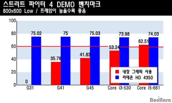 ¾Õ¼ »ìÆìº» ½ºÆ®¸®Æ®ÆÄÀÌÅÍ4 µ¥¸ðÀÇ Å×½ºÆ® °á°ú¸¦ º¸¸é Àú°¡Çü ±×·¡ÇÈ Ä«µå ATI ¶óµ¥¿Â HD 4350À» ÀåÂøÇÒ °æ¿ì ¾Æ¿¹ °ÔÀÓÀÌ ºÒ°¡´ÉÇÑ G31¿¡¼ ³·Àº ¿É¼ÇÀ¸·Î Æò±Õ 75 ÇÁ·¹ÀÓ °¡·®À» ±â·ÏÇÑ´Ù. G41À̳ª G45 ¸ÞÀκ¸µå¿¡¼µµ ¾à 2¹è ¾ÈÆÆÀÇ ÇÁ·¹ÀÓ Çâ»óÀ» º¸ÀδÙ.