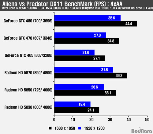 ¹Ý¸é, Aliens vs Predator´Â ´õÆ®2¿Í °°ÀÌ DirectX 11°ú Å×¼¿·¹À̼ÇÀ» Ȱ¿ëÇϰí ÀÖÁö¸¸, AA/ AF°¡ Àû¿ëµÇÁö ¾Ê´Â ȯ°æ¿¡¼´Â ¿ÀÈ÷·Á ¶óµ¥¿Â °è¿ÀÌ À¯¸®ÇÏ°Ô ³ªÅ¸³ª±âµµ Çß´Ù. ÀÌ´Â DirectX 11°ú Å×¼¿·¹À̼ÇÀÇ ºñÁßÀÌ ³ôÁö ¾Ê°í ´Ù¸¥ ÅØ½ºÃ³³ª ½¦ÀÌ´õ µîÀÇ ¿µÇâ¿¡ µû¸¥ ºÎºÐÀ¸·Î º¼ ¼ö ÀÖ¾î º¥Ä¡¸¶Å©¿Í ´Þ¸® ½ÇÁ¦ °ÔÀӵ鿡¼ Ç×»ó ÁöÆ÷½º GTX 400 ½Ã¸®Áî°¡ Ç×»ó À¯¸®ÇÏ´Ù°í¸¸ º¼ ¼ö ¾ø´Ù. ´Ù¸¸, ÁöÆ÷½º GTX 400 ½Ã¸®Áî´Â ÀÌÁ¦ µå¶óÀ̹ö°¡ °³¼±µÇ°í ÀÖ´Â ¸¸Å ¼º´ÉÀÌ Çâ»óµÉ ¿©Áö´Â ³²¾ÆÀÖ´Ù.