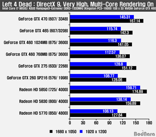 4 Dead °ÔÀÓÀº ¶óµ¥¿Â °è¿¿¡ ÃÖÀûÈµÈ °ÔÀÓÀÇ Çϳª·Î DirectX 9 ȯ°æÀÇ ÇÁ·¹ÀÓÀ» ºñ±³Çß´Ù. ÁöÆ÷½º GTX 460 768MB´Â ÁöÆ÷½º GTX 465º¸´Ù ³·Àº ÇÁ·¹ÀÓÀ» º¸¿©ÁÖ³ª ÀúÇØ»óµµº¸´Ù °íÇØ»óµµ¿¡¼´Â Â÷À̰¡ ÁÙ¾úÀ¸¸ç, ÁöÆ÷½º GTX 460 1GB´Â ÁöÆ÷½º GTX 465º¸´Ù °íÇØ»óµµ¿¡¼´Â ¿ÀÈ÷·Á ±Ù¼ÒÇÏ°Ô ¾Õ¼¹´Ù.