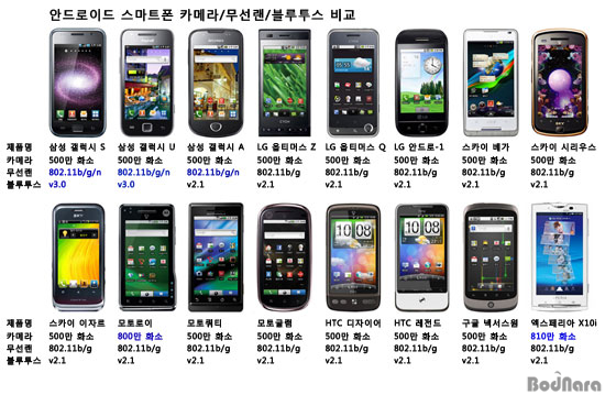 ¾Èµå·ÎÀ̵åÆùµéÀº ±âº»ÀûÀ¸·Î 500¸¸ È¼Ò Ä«¸Þ¶ó, 802.11b/g ¹«¼±·£, ºí·çÅõ½º v2.1À» Áö¿øÇϰí ÀÖ´Ù. ¹°·Ð Á¦Ç°¿¡ µû¶ó Ä«¸Þ¶ó, ¹«¼±·£, ºí·çÅõ½º »ç¾çÀ» ³ôÀÎ ¸ðµ¨µµ º¸ÀδÙ.