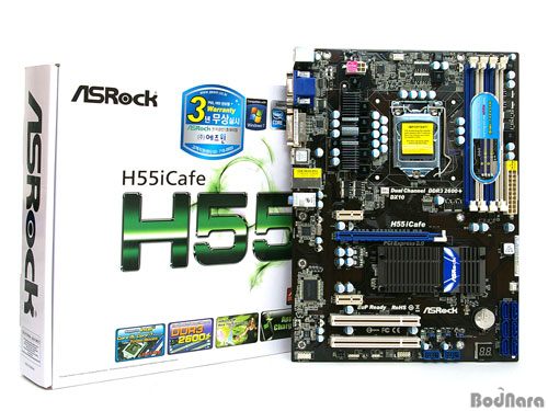 ASRock H55iCafe´Â ¼ÒÄÏ LGA1156 ¹æ½ÄÀÇ Intel Core i3/ i5/ i7 ÇÁ·Î¼¼¼¸¦ »ç¿ëÇÒ ¼ö ÀÖ´Â H55 Ĩ¼Â ¸ÞÀκ¸µå·Î, µ¿ÀÏÇÑ ¼ÒÄÏÀ» »ç¿ëÇÏ´Â P55 Ĩ¼ÂÀÇ ¸ÞÀκ¸µåº¸´Ù Àú·ÅÇÑ °¡°Ý¿¡ ½Ã½ºÅÛÀ» ±¸¼ºÇÒ ¼ö ÀÖÀ¸¸ç, Ŭ¶ôµ¥ÀÏ CPUÀÇ ³»Àå ±×·¡ÇÈ ÄÚ¾îÀÎ GMA HDÀÇ »ç¿ëÀÌ °¡´ÉÇØ º¸±ÞÇü ½Ã½ºÅÛÀ̳ª HTPC ±¸¼º, »ó´ëÀûÀ¸·Î °í°¡ÀÎ P55 Ĩ¼Â ¸ÞÀκ¸µåº¸´Ù Àú·ÅÇÑ °¡°Ý¿¡ ¸°ÇÊµå °è¿ CPU¸¦ ÀÌ¿ëÇÑ ½Ã½ºÅÛ ±¸¼ºÀÌ °¡´ÉÇÏ´Ù.