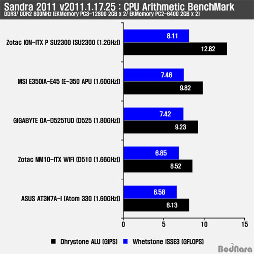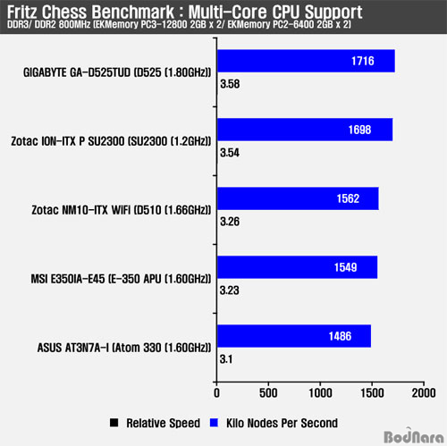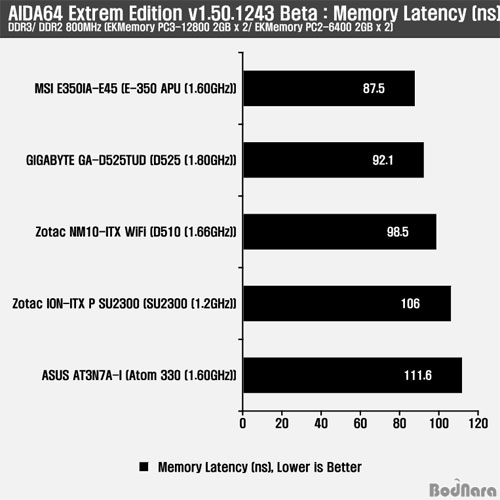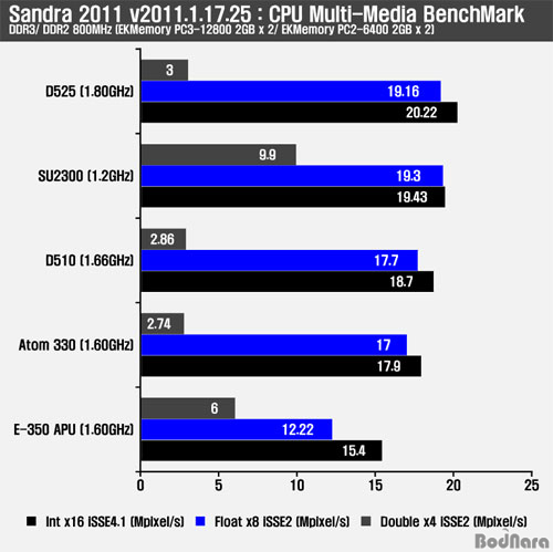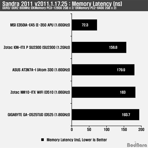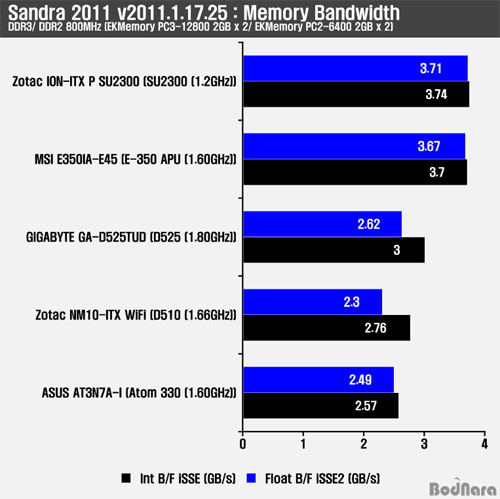 ÇÁ·Î¼¼¼µéÀÌ À¯±âÀûÀÎ ¿¬°á¿¡¼ ºÒ¸®ÇØ ¸Þ¸ð¸® ¼º´ÉÀÌ Ç϶ôµÇ¸ç, ¾ÆÅè D525/ D510Àº ½Ì±Ûä³Î ¸Þ¸ð¸®¸¦ Áö¿øÇØ µà¾óä³Î ¸Þ¸ð¸® ±¸¼ºÀÎ ¼¿·¯·Ð SU2300º¸´Ù ´ë¿ªÆøÀÌ ¶³¾îÁø´Ù. À̵鰣ÀÇ FSB ¿ª½Ã Â÷À̰¡ ÀÖÀ¸¸ç, FSB°¡ ³ôÀ»¼ö·Ï °°Àº Ŭ·°ÀÌ´õ¶óµµ ½Ã½ºÅÛ ¼º´ÉÀÌ ´õ ³ô¾ÆÁø´Ù. D525/ D510´Â ½Ì±Ûä³Î ¸Þ¸ð¸®¸¦ ±¸¼ºÇÔ¿¡µµ ¸Þ¸ð¸® ÄÁÆ®·Ñ·¯ÀÇ ÅëÇÕ´öºÐÀÎÁö ¸Þ¸ð¸® ´ë¿ªÆøÀÌ µà¾óä³Î ±¸¼ºÀ» Áö¿øÇÏ´Â ¾ÆÅè 330º¸´Ù ¾à°£ ³ô°Ô ÃøÁ¤µÇ¾úÀ¸¸ç, AMD E-350Àº ½Ì±Ûä³Î ¸Þ¸ð¸®¸¦ Áö¿øÇϳª ¸Þ¸ð¸® ÄÁÆ®·Ñ·¯ ÅëÇÕÀ¸·Î ¸Þ¸ð¸® ´ë¿ªÆø°ú ·¹ÀÌÅϽÿ¡¼ ÀåÁ¡À» °¡Áö¸ç, ÀúÀü·Â ¼¿·¯·Ð SU2300Àº ¸Þ¸ð¸® ÄÁÆ®·Ñ·¯¸¦ ³»ÀåÇÏÁö ¾Ê¾ÒÀ¸³ª ¸Þ¸ð¸® ´ë¿ªÆøÀÌ ´Ù¸¥ Ç÷§Æûº¸´Ù ³ô°Ô ÃøÁ¤µÈ´Ù.