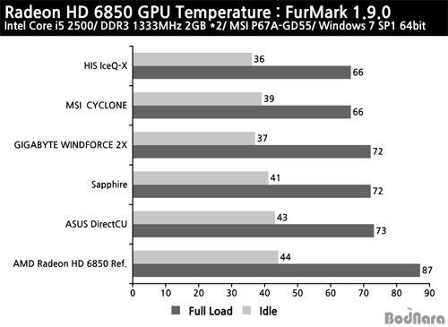 ¸Þ¸ð¸® ¿Âµµ´Â Å×½ºÆ® »ùÇà Áß À¯ÀÏÇÏ°Ô ¹æ¿ÆÇ°ú Äð¸µÆÒÀÇ È¿°ú¸¦ µ¿½Ã¿¡ º¸´Â GIGABYTE WINDFORCE 2X°¡ °¡Àå ³·°Ô ÃøÁ¤µÇ¾ú´Ù. ¹Ý¸é, AMD Radeon HD 6850 ·¹ÆÛ·±½ºÀÇ °æ¿ì ¸Þ¸ð¸® ¹æ¿ÆÇÀ» °®ÃèÁö¸¸ Äð¸µÆÒÀÇ È¿°ú¸¦ º¼ ¼ö ¾ø´Â ±¸Á¶»ó °¡Àå ³ôÀº ¿Âµµ ¸Þ¸ð¸® ¿Âµµ¸¦ ±â·ÏÇß´Ù.
