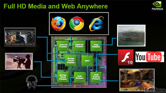 Å×±×¶ó 2´Â ¼¼°è ÃÖÃÊ·Î ¸ð¹ÙÀÏ À¥À» À§ÇÑ ¸ñÇ¥·Î CPU ¿ªÇÒÀ» ÇÏ´Â µà¾ó ÄÚ¾î ARM Cortex A9¸¦ Æ÷ÇÔÇØ 8°³ÀÇ µ¶¸³ ÇÁ·Î¼¼¼¸¦ Çϳª·Î ¸ðÀº SoC·Î ¸ðµç ÇÁ·Î¼¼¼¿¡¼ °øÀ¯ ÀÌ¿ëÀÌ °¡´ÉÇÑ 1MBij½Ã, I/O ±â´É, NAND ¸Þ¸ð¸® ÄÁÆ®·Ñ·¯, µð½ºÇ÷¹ÀÌ Ãâ·Â ¿£Áø µîÀ» °®Ãá ±¸¼ºÀ» Çϰí ÀÖ´Ù. ƯÈ÷ MPUÀÎ Cortex-A9À» Á¦¿ÜÇÑ ´Ù¸¥ ¸ðµç IP´Â NVIDIA°¡ ÀÚüÀûÀ¸·Î °³¹ßÇÑ IPµéÀÌ´Ù.