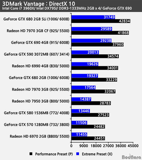 3DMark Vantage´Â DX10 ȯ°æ Å×½ºÆ® ÇÁ·Î±×·¥À¸·Î ÁöÆ÷½º GTX 690Àº µ¿ÀÛ Å¬·°ÀÌ ÁöÆ÷½º GTX 680°ú Å« Â÷À̰¡ ¾ø´Âµ¥ ÁöÆ÷½º GTX 680 2GB SLi ±¸¼ºÀÇ GPU ºÎ½ºÆ® (GPU Boost) Ŭ·° Â÷ÀÌ¿¡ µû¶ó ¼º´É Â÷°¡ ³ªÅ¸³µ´Ù. ±×·¯³ª ¶óµ¥¿Â HD 7970 3GB CF ±¸¼º°ú´Â ÇØ»óµµ°¡ ³·Àº ÆÛÆ÷¸Õ½º¿¡´Â ºÒ¸®ÇßÀ¸³ª ÇØ»óµµ°¡ ³ô¾ÆÁø ÀͽºÆ®¸²¿¡´Â °ÅÀÇ ±ÙÁ¢ÇÑ ¼º´ÉÀ» ³»Áá´Ù. ±âÁ¸ ¼¼´ë ÁöÆ÷½º GTX 590À̳ª ¶óµ¥¿Â HD 6990Àº °¡º±°Ô ³Ñ¾î¼¹´Ù.