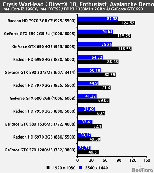 Crysis WarHead´Â °í»ç¾çÀ» ¿ä±¸ÇÏ´Â °ÔÀÓ ÁßÀÇ Çϳª·Î ¸Þ¸ð¸® ¹ö½º¿Í ¸Þ¸ð¸® ´ë¿ªÆø µî¿¡ ¿µÇâÀ» ¹Þ´Â´Ù. À̹ø Å×½ºÆ®´Â DirectX 10°ú Enthusiast ±×·¡ÇÈ ¼³Á¤À» Àû¿ëÇØ ÁøÇàÇß´Ù.