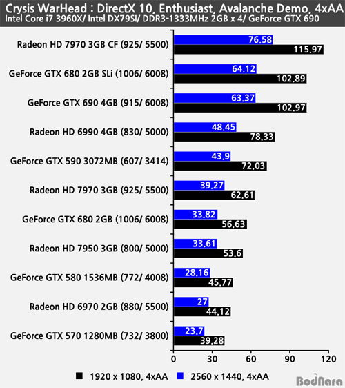 ÁöÆ÷½º GTX 690Àº 3DMark Vantage¿¡¼ÀÇ °á°ú¿Í ´Þ¸® ÁöÆ÷½º GTX 680 2GB SLi ±¸¼º°ú µ¿ÀÛ Å¬·°ÀÇ Â÷ÀÌ¿¡µµ ºÒ±¸ AA ¹ÌÀû¿ë ¹× 4xAA Àû¿ë ¸ðµÎ °ÅÀÇ Â÷À̾ø´Â ¼º´ÉÀ» ³»Áá´Ù. À̹ø¿¡´Â ¶óµ¥¿Â HD 7970 3GB CF°¡ °¡Àå ³ôÀº ¼º´ÉÀ» ³»ÁØ´Ù. À̹ø °á°ú ¿ª½Ã ¶óµ¥¿Â HD 7970°ú´Â ¸Þ¸ð¸® ºñÆ® ¼ö¿Í ¸Þ¸ð¸® ¿ë·® µîÀÇ ¿µÇâÀ¸·Î °íÇØ»óµµ¿¡¼ ºÒ¸®Çß´Ù.