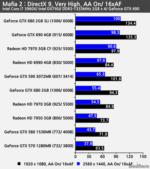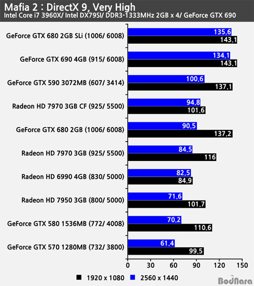 Mafia 2 °ÔÀÓÀº DirectX 9 ȯ°æ°ú Very High, PhysX Off ±×·¡ÇÈ ¿É¼ÇÀ» Àû¿ëÇØ Å×½ºÆ®¸¦ ÁøÇàÀ¸¸ç, ¶óµ¥¿Â HD 6990À̳ª ¶óµ¥¿Â HD 7970 3GB CF ¸ðµÎ ¸ÖƼ GPU ±¸¼º½Ã ÃÖÀûÈÀÇ ¿µÇâÀÎÁö Á¦´ë·Î ¼º´ÉÀ» ³»ÁÖÁö ¸øÇß´Ù. ÁöÆ÷½º GTX 690Àº Å©¶óÀ̽ýº ¿öÇØµå (Crysis Warhead)¿¡ À̾î ÁöÆ÷½º GTX 680 2GB SLi¿¡ ±ÙÁ¢ÇÑ ¼º´ÉÀ» ³»ÁØ´Ù.