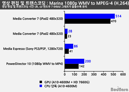 3Á¾ÀÇ ÇÁ·Î±×·¥ ¸ðµÎ´Â ÀÛÀº ¿ë·®ÀÇ ¿µ»ó º¯È¯¿¡´Â CPU ´Üµ¶°ú CPU+GPU (A10-4600M + HD 7660G) Á¶ÇÕ°ú Å« Â÷À̸¦ Á¦°øÇÏÁö ¸øÇßÀ¸³ª ¿ë·®ÀÌ Å« ¿µ»ó ÆÄÀÏÀ» º¯È¯ÇÒ ¶§´Â ÀÌ¿¡ µû¸¥ ½Ã°£ Â÷À̰¡ ¹ß»ýÇÑ´Ù. ¿µ»óÀÇ °æ¿ì ºñÆ®·¹ÀÌÆ®³ª ÇØ»óµµ Å©±â, ¿ë·® µî¿¡ µû¶ó ó¸® ¼Óµµ°¡ ´Þ¶óÁø´Ù.