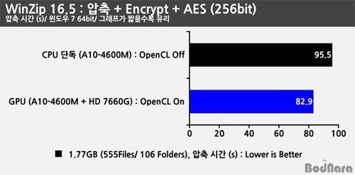 ¾ÐÃà Å×½ºÆ®´Â Encrypt¿Í AES (265bit) ¿É¼ÇÀ» Ãß°¡ÇØ CPU ´Üµ¶ ó¸®¿Í OpenCLÀ» Ȱ¼ºÈÇÑ CPU+GPU (A10-4600M + HD 7660G) Á¶ÇÕÀº ÈÄÀÚ°¡ »¡¶úÀ¸¸ç, ÀÌ´Â GPU °¡¼ÓÀÇ µµ¿òÀ» ÅëÇØ °¡´ÉÇß´Ù. ¾ÐÃà ¿ª½Ã ÆÄÀÏ ¿ë·®°ú ¼ö¿¡ µû¶ó ¼Óµµ°¡ ´Þ¶óÁö´Âµ¥ CPU ´Üµ¶º¸´Ù´Â CPU¿Í GPU¸¦ ¸ðµÎ ÀÌ¿ëÇÒ °æ¿ì ó¸® ½Ã°£Àº ±×¸¸Å Çâ»óµÈ´Ù.