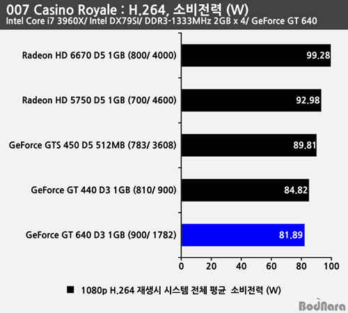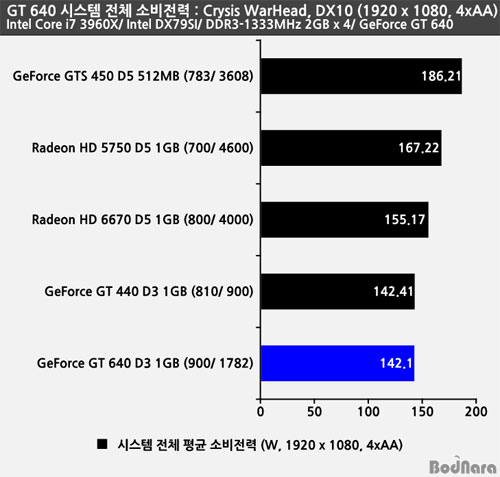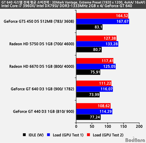 Crysis WarHead °ÔÀÓÀÇ Àüü ½Ã½ºÅÛ ¼ÒºñÀü·ÂÀÇ Æò±Õ°ªÀ» ºñ±³ÇÑ °á°ú HD ¿µ»ó Àç»ýÀ̳ª 3DMark VantageÀÇ °á°ú¿Í ¸¶Âù°¡Áö·Î ÁöÆ÷½º GT 640Àº ¿ì¼öÇÑ ¸ð½ÀÀ» Á¦°øÇß´Ù. ÁöÆ÷½º GT 440º¸´Ù ³ôÀº ÇÁ·¹ÀÓÀ» Á¦°øÇÏ¸é¼ Àü·Â ¼Ò¸ð´Â °ÅÀÇ °°Àº ¼öÁØÀÌ´Ù.