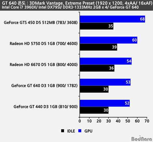 ¿Âµµ´Â °³¹æµÈ »óÅÂÀÇ »ç¹«½Ç¿¡¼ ÃøÁ¤ÇÏ¿´À¸¹Ç·Î ÄÉÀ̽º ³»ºÎ¿¡ ÀåÂøµÈ °æ¿ì¿Í ´Þ¶ó »ó´ëÀûÀÎ ºñ±³·Î Âü°íÇÏÀÚ. ÁöÆ÷½º GT 640Àº 28nm °øÁ¤ÀÌ Àû¿ëµÈ Á¦Ç°´ä°Ô ÀÛÀº Ä𷯸¦ ÀåÂøÇßÀ½¿¡µµ °æÀï Á¦Ç°º¸´Ù ³·°í Ŭ·°ÀÌ ³ô°Ô ¼³Á¤µÇ¾úÀ½¿¡µµ ÁöÆ÷½º GT 440°ú Å« Â÷À̾ø´Â ¿Âµµ¸¦ Á¦°øÇß´Ù.