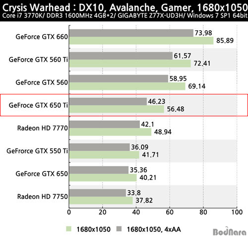 ´ëÇ¥ÀûÀÎ °í»ç¾ç °ÔÀÓÀÎ Crysis Warhead¿¡¼ ÁöÆ÷½º GTX 650 Ti´Â ÀÌÀü ¼¼´ë ÆÛÆ÷¸Õ½º ¸ðµ¨ÀÎ GTX 560°ú ÄÉÇ÷¯ ¾ÆÅ°ÅØÃ³ ¸ÞÀνºÆ®¸² ¸ðµ¨ÀÎ GTX 650 »çÀÌÀÇ Áß°£ Á¤µµ ¼º´ÉÀ» º¸¿©Áִµ¥ ÀÌ´Â AA¸¦ Àû¿ëÇßÀ» ¶§µµ µ¿ÀÏÇÑ ¸ð½ÀÀ̸ç, HD 7770°ú ºñ±³½Ã¿¡´Â GTX 650 Ti°¡ È®½ÇÈ÷ ¿ì¼öÇÑ ¼º´ÉÀ» Á¦°øÇϰí ÀÖ´Ù.