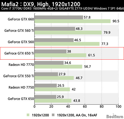 Mafia2ÀÇ °æ¿ì ÁöÆ÷½º GTX 650 TiÀÇ ¼º´ÉÀº GTX 560 ´ëºñ 80% ¼öÁØ, HD 7770 ´ëºñ 110% Á¤µµ ¼öÁØÀ» ±â·ÏÇϰí Àִµ¥, Àý´ë ¼º´É »ó GTX 560º¸´Ù HD 7770¿¡ °¡±î¿î ¼º´ÉÀ» º¸¿©ÁÖ°í ÀÖÀ¸¸ç, AA¿Í AF Àû¿ë ¿©ºÎ¿¡ °ü°è¾øÀÌ GTX 650 Ti°¡ ³ôÀº ¼º´ÉÀ» Á¦°øÇÏÁö¸¸, AA¿Í AF ¹ÌÀû¿ë »óÅÂÀÏ ¶§ GTX 650 TiÀÇ ¼º´É Â÷À̰¡ AA¿Í AF Àû¿ë »óÅ¿¡¼ÀÇ ¼º´É Â÷À̺¸´Ù Å« °ÍÀ» ¾Ë ¼ö ÀÖ´Ù.