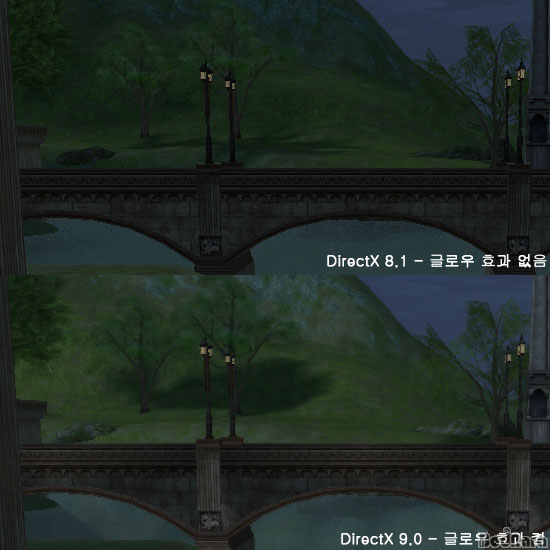 WOW¿¡¼­ DX ¼¼´ëº° °¡Àå Å« Â÷À̰¡ ±¤¿øÈ¿°ú¿´µí, ¸®´ÏÁö2¿¡¼­µµ ¼¼´ëº°·Î °¡Àå Å« Â÷À̸¦ ³ªÅ¸³»´Â ºÎºÐÀº ±¤¿ø È¿°úÀÌ´Ù. DirectX 9¸¦ Áö¿øÇÏ´Â ±×·¡ÇÈÄ«µå¿¡¼­¸¸ »ç¿ëÇÒ ¼ö ÀÖ´Â ±Û·Î¿ì È¿°ú¸¦ ÄÓ °æ¿ì °¡·ÎµîÀÇ ºÒºûÀÌ ³ª¹«¿¡ ºñÄ¡¸é¼­ »ý±â´Â ±×¸²ÀÚÀÇ Ç¥Çö¿¡ Â÷À̰¡ »ý±ä °ÍÀ» º¼ ¼ö ÀÖ´Ù. ±× ¿Ü¿¡µµ ±¤¿øÀÇ ¹æÇâ¿¡ µû¶ó¼­ È­¸é °÷°÷ÀÇ ¹à±â Ç¥Çö¿¡ Â÷À̰¡ ÀÖ¾ú´Ù.
