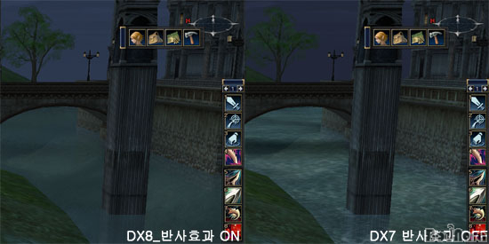 DX8°ú DX7ÀÇ Â÷ÀÌÀÎ ¹Ý»çÈ¿°ú´Â ¼ö¸éÀÇ ½ºÅ©¸°¼¦¿¡¼­ È®ÀÎÇÒ ¼ö Àִµ¥, ¹Ý»çÈ¿°ú°¡ ²¨Áø °æ¿ì ¼ö¸éÀº ³Ê¿ï À§ÁÖ·Î ¹¦»ç°¡ µÇÁö¸¸, ¹Ý»çÈ¿°ú¸¦ Ä×À» °æ¿ì ´Ù¸¥ ÇÇ»çüÀÇ ¹Ý¿µÀ» À§ÁÖ·Î ¹¦»ç°¡ µÇ¾ú´Ù. Çö½Ç¿¡¼­´Â ¹°ÀÇ Åõ¸íµµ¿Í Ãø¸é±¤¿¡ µû¶ó¼­ DX8ó·³ ¹Ý¿µÀÌ ´õ Àß º¸ÀÏ ¶§µµ ÀÖ°í, ¹Ø¹Ù´ÚÀÌ µå·¯³¯ ¶§µµ Àֱ⠶§¹®¿¡ µüÈ÷ DX8ÀÇ ¹¦»ç°¡ ´õ ÁÁ´Ù°í ¸»Çϱ⠾î·Á¿î ºÎºÐÀÌ´Ù.