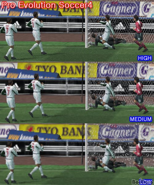 PES4¿¡¼­´Â µðÅ×ÀÏ ¼³Á¤¿¡ µû¸¥ Â÷À̰¡ ±¤¿øÈ¿°ú»Ó¸¸ ¾Æ´Ï¶ó ÅØ½ºÃÄÀÇ À±°û µå·ÎÀ׿¡µµ Å« Â÷À̸¦ ÁØ´Ù. High·Î ¼³Á¤ÇÏ°í °ÔÀÓÀ» Áñ±æ °æ¿ì Ç÷¹À̽ºÅ×À̼ǰú´Â ºñ±³µµ ÇÒ ¼ö ¾ø´Â °íÈ­Áú·Î °ÔÀÓÀ» Áñ±æ ¼ö ÀÖÀ¸³ª, LowÀÎ °æ¿ì¿¡´Â ¾ÈƼ¾Ë¸®¾Æ½ÌÀÌ ÀüÇô µÇÁö ¾ÊÀº ±ïµÎ±âÁø È­¸éÀ¸·Î °ÔÀÓÀ» Áñ°Ü¾ß ÇÑ´Ù. ¼±¼öµéÀÇ Æ¯Â¡ ¹¦»ç°¡ Àß µÇ¾î ÀÖ´Â Ã౸ °ÔÀÓ¿¡¼­ ¸ðµç ¼±¼öÀÇ ¾ó±¼ÀÌ ¶È°°¾Æ º¸ÀÎ´Ù¸é ¾ÈŸ±î¿î ÀÏÀÌ ¾Æ´Ò ¼ö ¾ø´Ù.