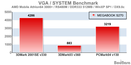 PCMark04 ½Ã½ºÅÛ º¥Ä¡¸¶Å© ¼º´ÉÀº 3219Á¡À¸·Î ¼¼ºÎÀûÀ¸·Î´Â CPU 3400Á¡, ¸Þ¸ð¸® 2901Á¡, VGA 969Á¡, HDD 2234Á¡À¸·Î ³ªÅ¸³µ´Ù. ¾Æ¹«¸® ¸Þ¸ð¸® ÄÁÆ®·Ñ·¯°¡ CPU¿¡ ³»ÀåµÇ¾î ¸Þ¸ð¸® ¼º´ÉÀÌ ³ôÀº Athlon64Áö¸¸ Sandra Å×½ºÆ® °á°ú¿Í ¸¶Âù°¡Áö·Î DDR333¿¡ ³»Àå ±×·¡ÇÈ ±â´É¿¡ ¸Þ¸ð¸®¸¦ ÇÒ´çÇÏ¿´±â ¶§¹®¿¡ ¼º´ÉÀÌ ¶³¾îÁö´Â °ÍÀ¸·Î ÃøÁ¤µÇ¾ú´Ù.