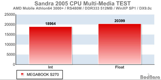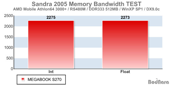 Sandra 2005ÀÇ ¸Þ¸ð¸® ´ë¿ªÆø Å×½ºÆ® °á°ú´Â Athlon64 Ç÷§ÆûÀ¸·Î´Â »ó´çÈ÷ ³·Àº °á°ú°¡ ³ª¿Ô´Ù. ±× ÀÌÀ¯´Â DDR400 ¸Þ¸ð¸®°¡ ¾Æ´Ñ DDR333 ¸Þ¸ð¸®¸¦ »ç¿ëÇϰí Àִµ¥´Ù, ¼ÒÄÏ 754 CPUÀ̱⠶§¹®¿¡ µà¾óä³ÎÀÌ ¾Æ´Ñ ½Ì±Ûä³Î ¸Þ¸ð¸®·Î¸¸ µ¿ÀÛÇϸç, ³»Àå ±×·¡ÇÈ ±â´ÉÀ» À§ÇØ ½Ã½ºÅÛ ¸Þ¸ð¸® ÀϺθ¦ ÇÒ´çÇÑ °ÍÀÌ Á¾ÇÕÀûÀ¸·Î ¸Þ¸ð¸® ´ë¿ªÆø ÀúÇÏ¿¡ ¿µÇâÀ» ¹ÌÄ£ °ÍÀ¸·Î º¸ÀδÙ.