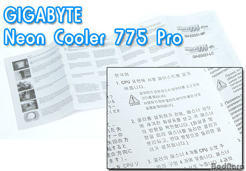 GIGABYTE Neon Cooler 775 Pro´Â Pro¿Í BL ¹öÀü °ø¿ëÀ¸·Î ¸¸µé¾îÁ® ÀÖÀ¸¸ç ¸îÄÆÀÇ »çÁø°ú ´Ü°èº° ÀåÂø ¹æ¹ýÀÌ ¼³¸íµÇ¾î ÀÖÀ¸³ª »çÁøÀº Èæ¹éÀÌ´Ù. ±×·¯³ª ´Ù±¹¾î ¼³¸í¼­·Î ¸¸µé¾îÁ® ÀÖÀ¸¸ç Çѱ¹¾îµµ Áö¿øÇϰí ÀÖ´Ù.